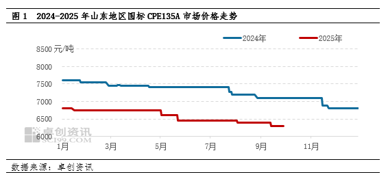 2025年三季度CPE市场价格重心小幅下移,均价同比及环比均下跌,截至9月30日,山东地区国标CPE135A三季度均价6396元/吨,环比下跌202元/吨,跌幅3.06%,同比下跌809元/吨,跌幅10.74%。